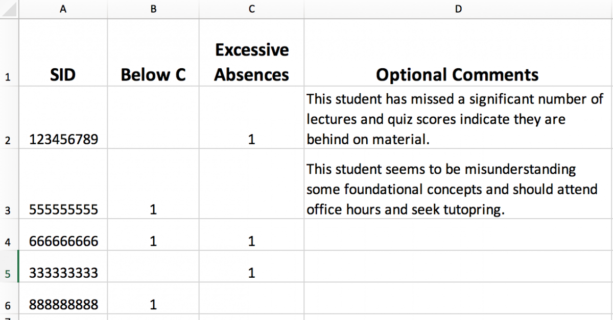 Please Note: Only include students in the file who should receive an alert notification, not the full roster. If any of those .csv columns have a value, it will generate an alert record!