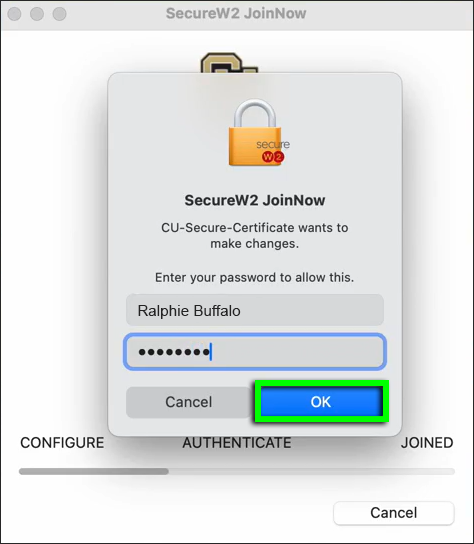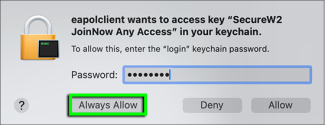 If asked to allow eapolclient to access the "SecureW2 JoinNow Any Access" key in your keychain: