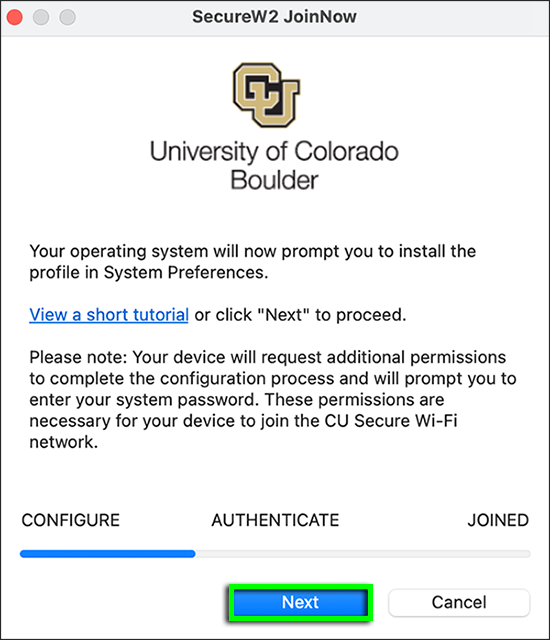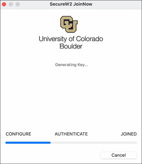 If you're on campus, the onboarding client will indicate that it's authenticating to CU Secure.