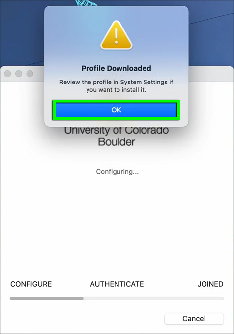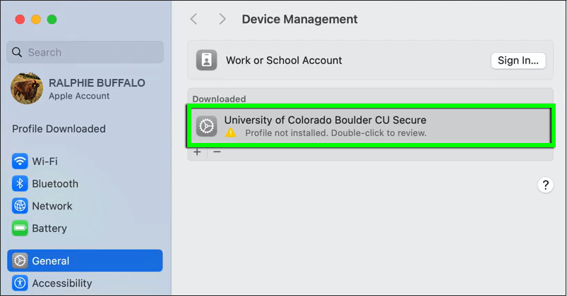 Please note: For older macOS systems, go to System Settings > Profiles to find the CU Secure profile.
