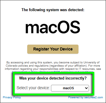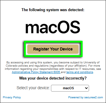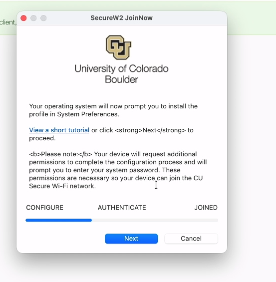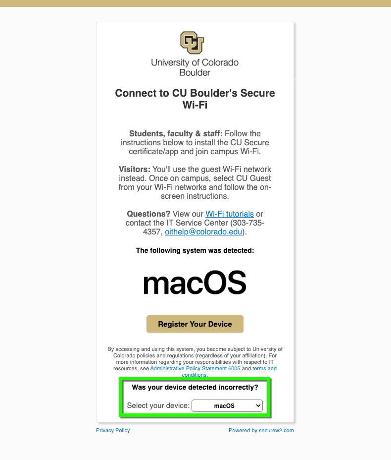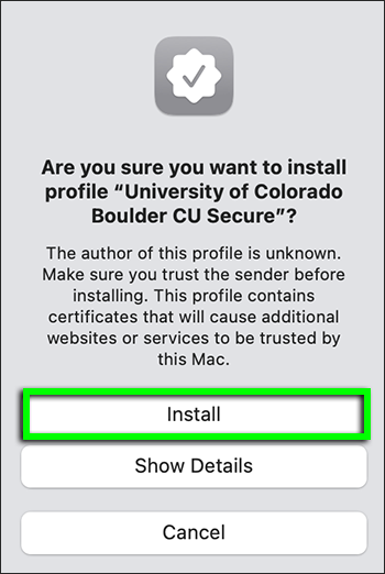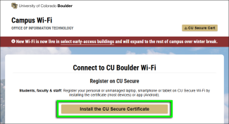 Using Safari,* go to wifi.colorado.edu, then click the Install the CU Secure Certificate button.