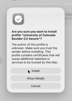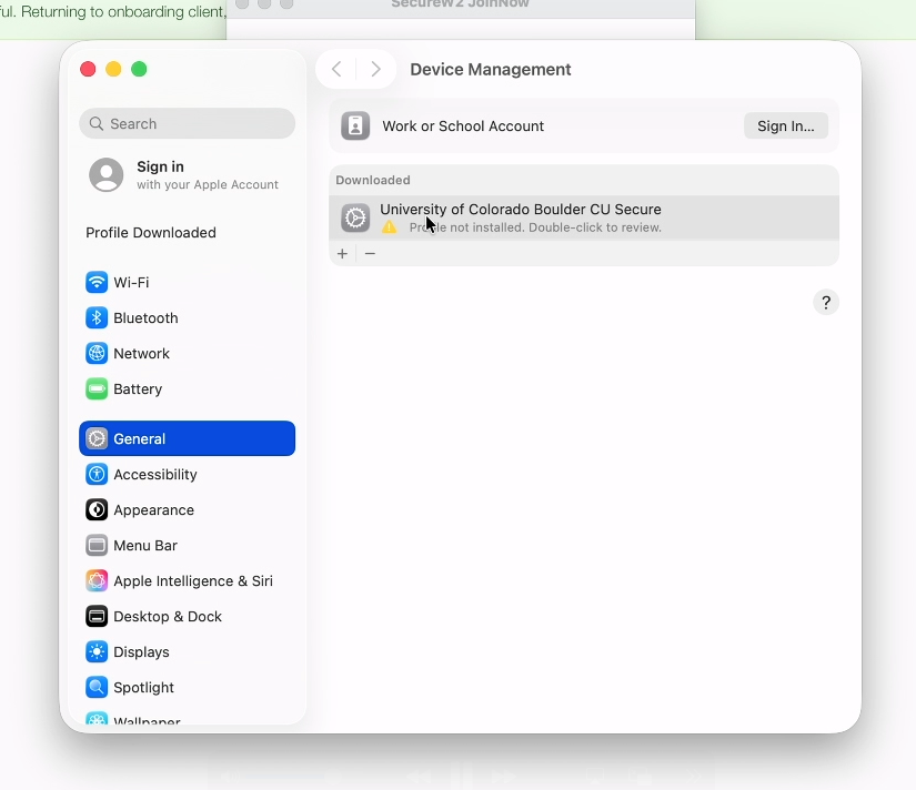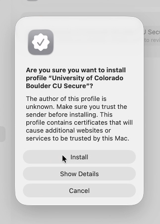 Go to System Settings > General > Device Management and double-click to open the University of Colorado Boulder CU Secure profile.