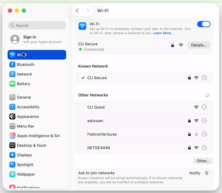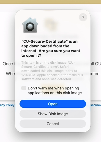 Note: If you're not currently in range of CU Secure Wi-Fi, you'll likely see this prompt when you first connect to CU Secure.
