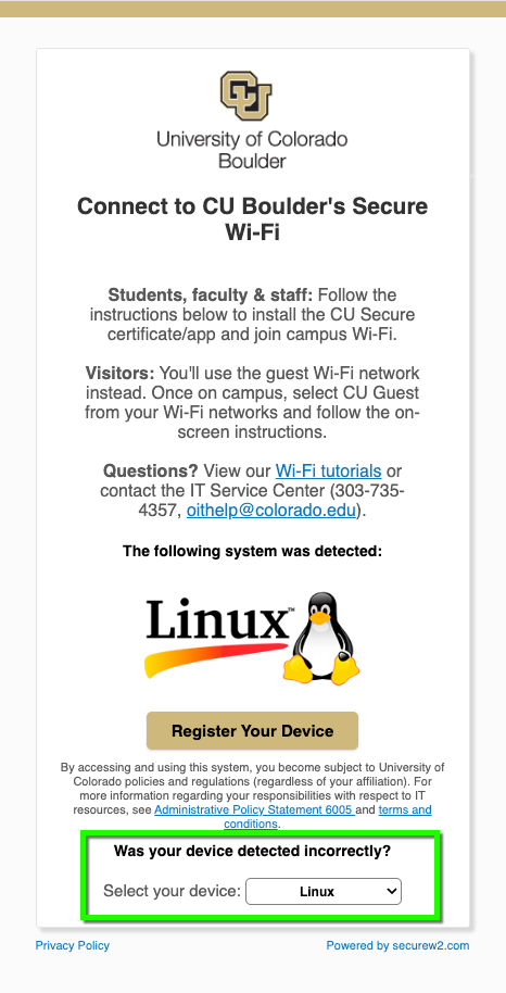 Go to wifi.colorado.edu, then click the Install the CU Secure Certificate button.