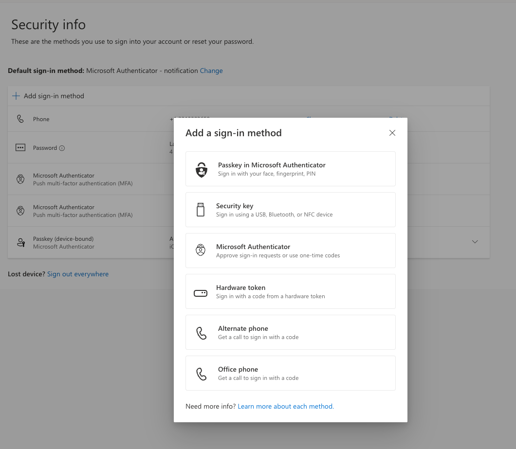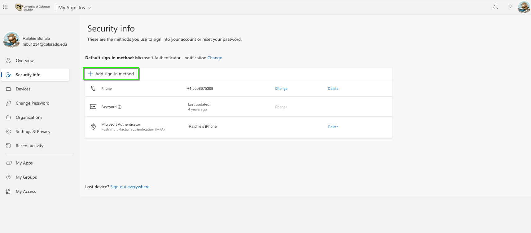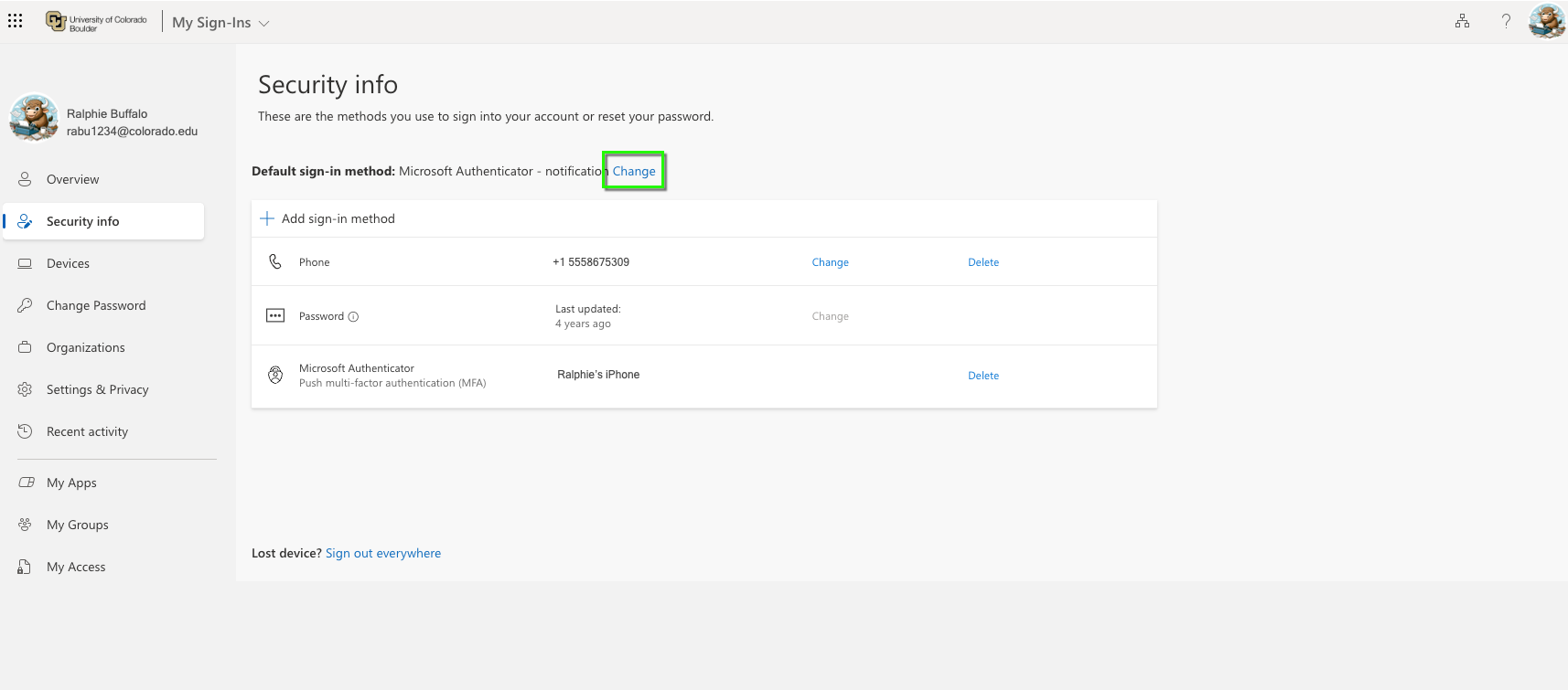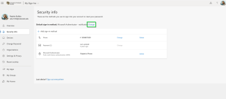 The security info screen will show your default sign-in method and list all authentication methods currently connected to your account. If you followed our Register and Set Up Microsoft Authenticator App tutorial, you will have the Microsoft Authenticator app set as your default method (as shown in screenshot). If you chose another method during set up, it will be shown here.