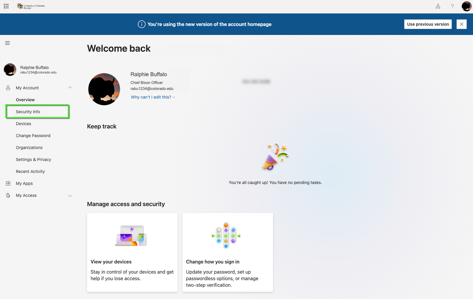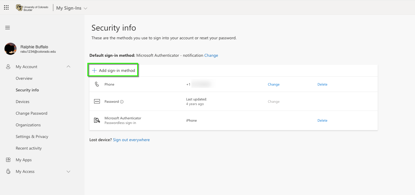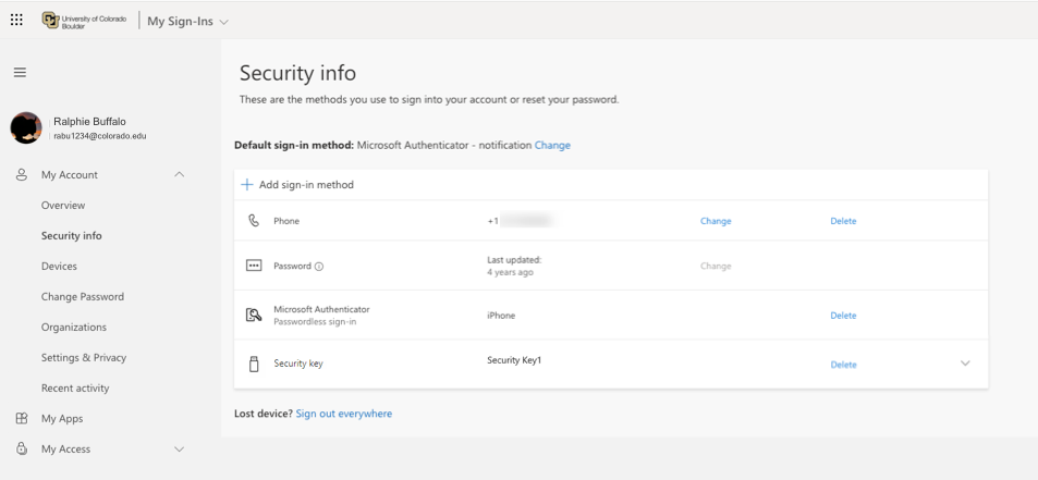 Log in to the Microsoft 365 My Account page. In the My Account section on the left hand side of the window, select Security Info.